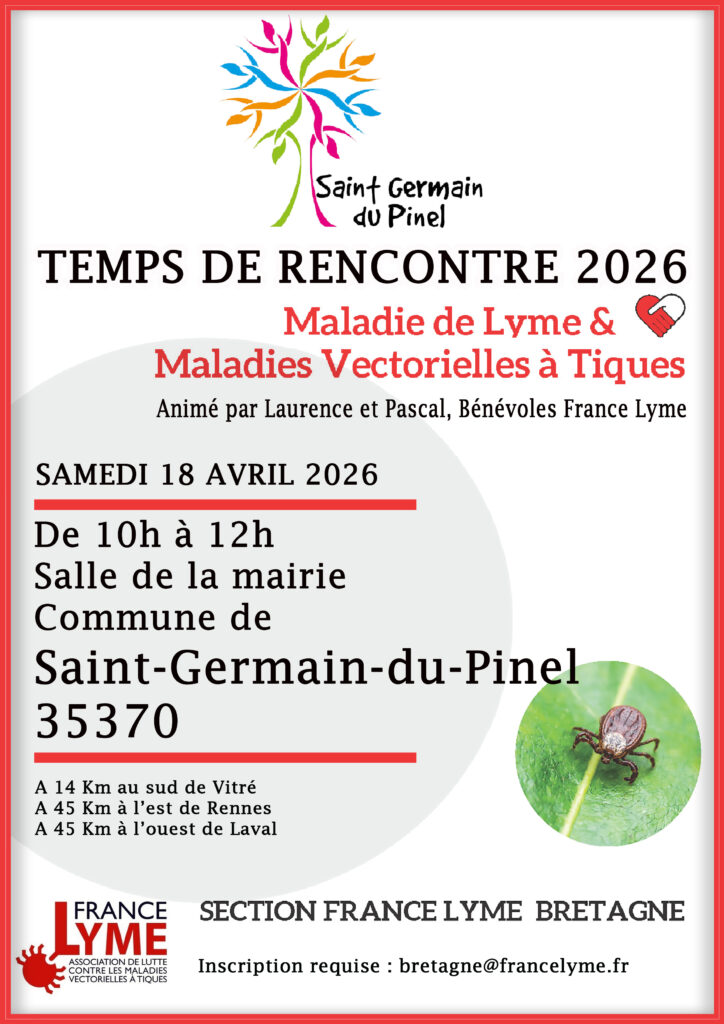 La prochaine rencontre en Ille-et-Vilaine (Café Lyme) aura lieu à Saint-Germain-du-Pinel le samedi 18 avril 2026, de 10 h à 12 h, dans la salle des mariages de la mairie.
