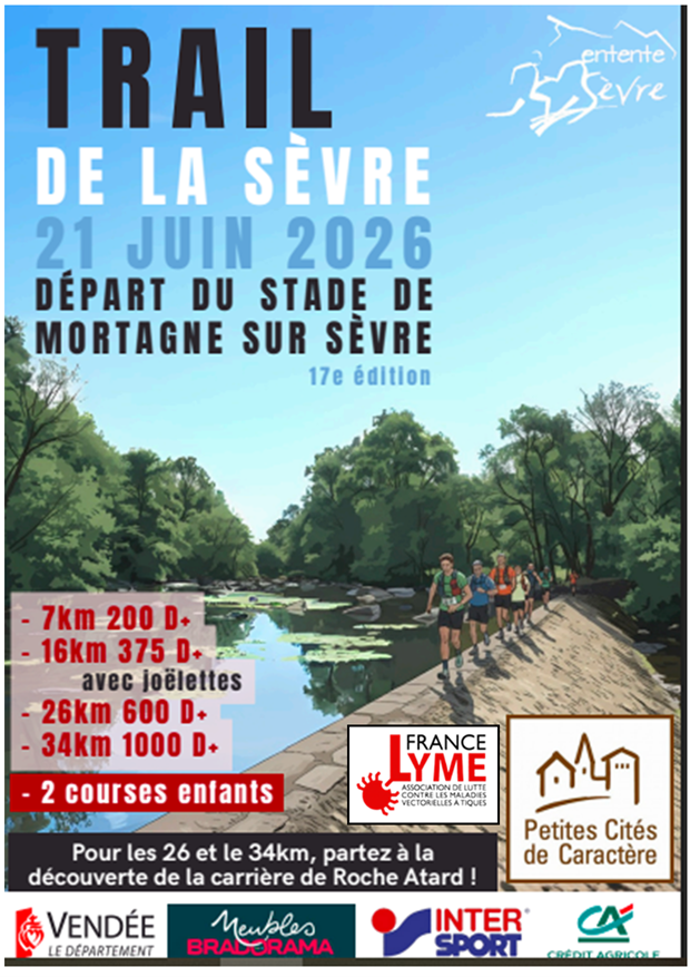 La section Vendée de l’association France Lyme vous informe de la tenue d’un stand d’information et de prévention sur la maladie de Lyme, au « trail de la Sèvre » le 21 juin 26 à Mortagne sur sèvre.
